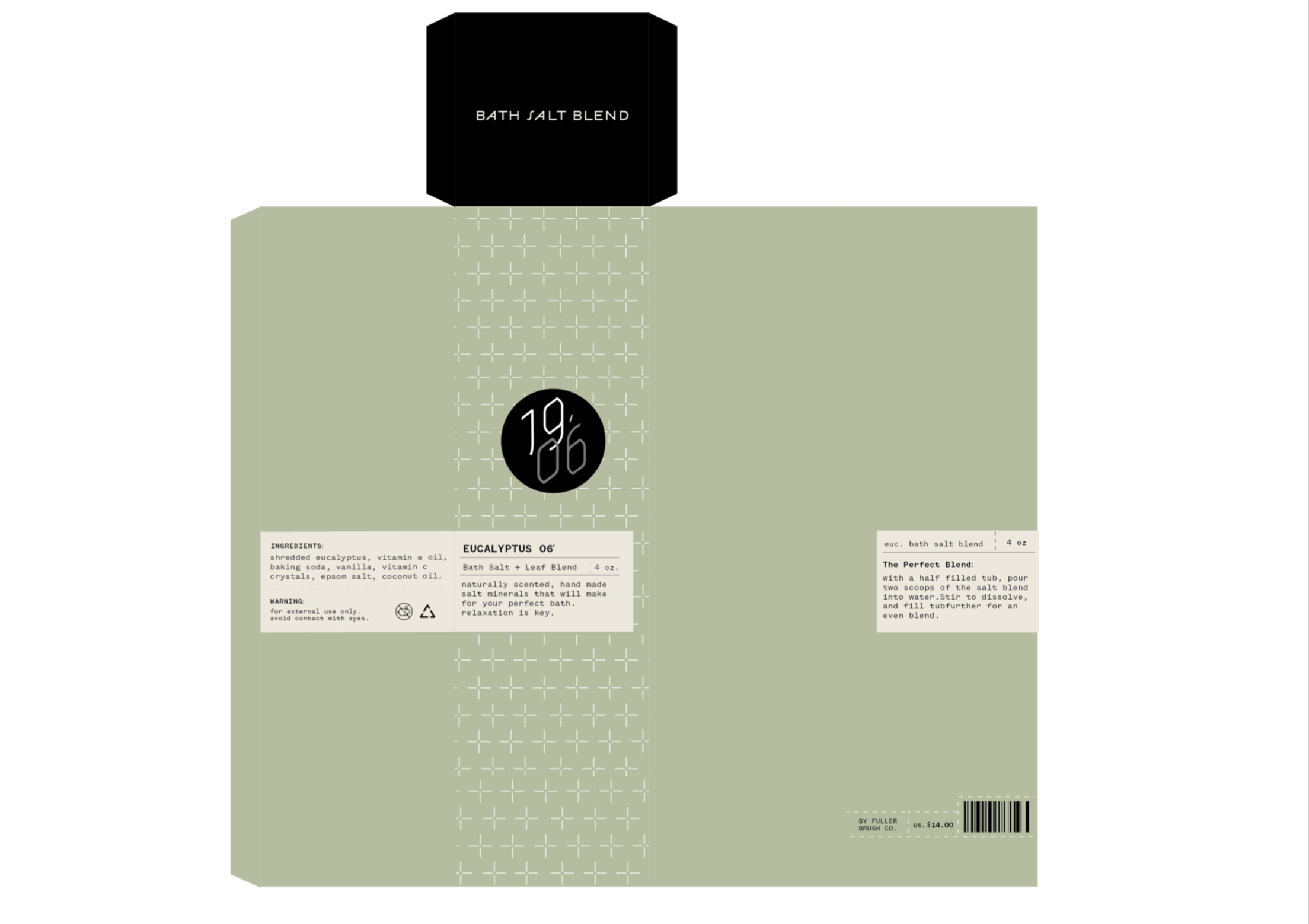 1906 is a conceptual self-care brand under the Fuller Brush Company, featuring a collection of three eucalyptus-based products: bath salts, candles, and matches. Designed as a mid-tier, accessible line, 1906 blends refreshing, soothing elements with a deep connection to nature, prioritizing all-natural, cruelty-free ingredients. Fuller Brush has long felt outdated, so I gave it the 21st-century boost it needed to stay afloat!